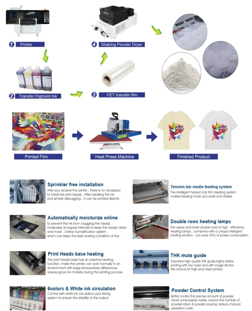 These printers support roll-fed DTF film, CMYKWW inks for opaque whites on dark textiles, and resolutions up to 1440 dpi for detailed patterns. They integrate with powder shakers and heat presses for end-to-end workflows, compatible with fabrics like silk and denim. Maintenance includes regular ink shaking and printhead cleaning to prevent clogs.